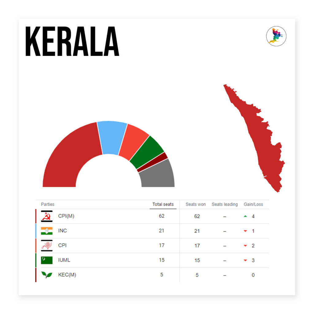 In Kerala, the red wave swept the region in a first-of-its-kind instance, as it was the norm in the State to always follow anti-incumbency as far as elections were concerned. Left Democratic Front rode the high waves of victory, as it bagged 99 seats of the 140-strong Assembly, with United Democratic Front bagging just 41 seats. Surprisingly, the front that gave the Left tough competition in many strategic seats was BJP, which, however, came a cropper as the results were finalised.